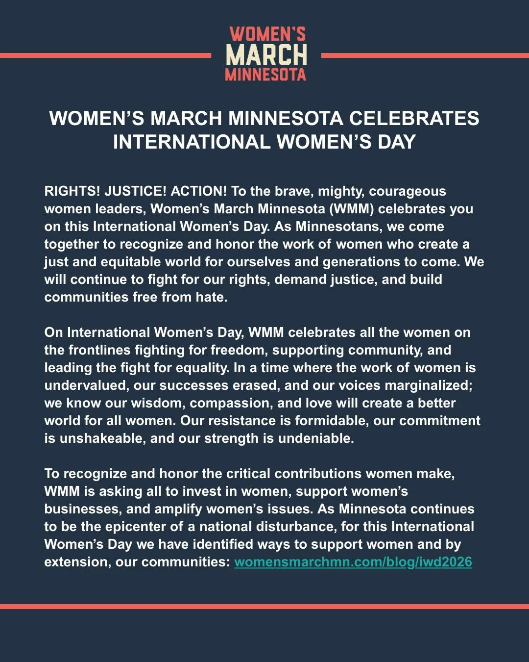 To recognize and honor the critical contributions women make, WMM is asking all to invest in women, support women’s businesses, and amplify women’s issues. As Minnesota continues to be the epicenter of a national disturbance, for this International Women’s Day we have identified ways to support women and by extension, our communities: https://www.womensmarchmn.com/blog/iwd2026